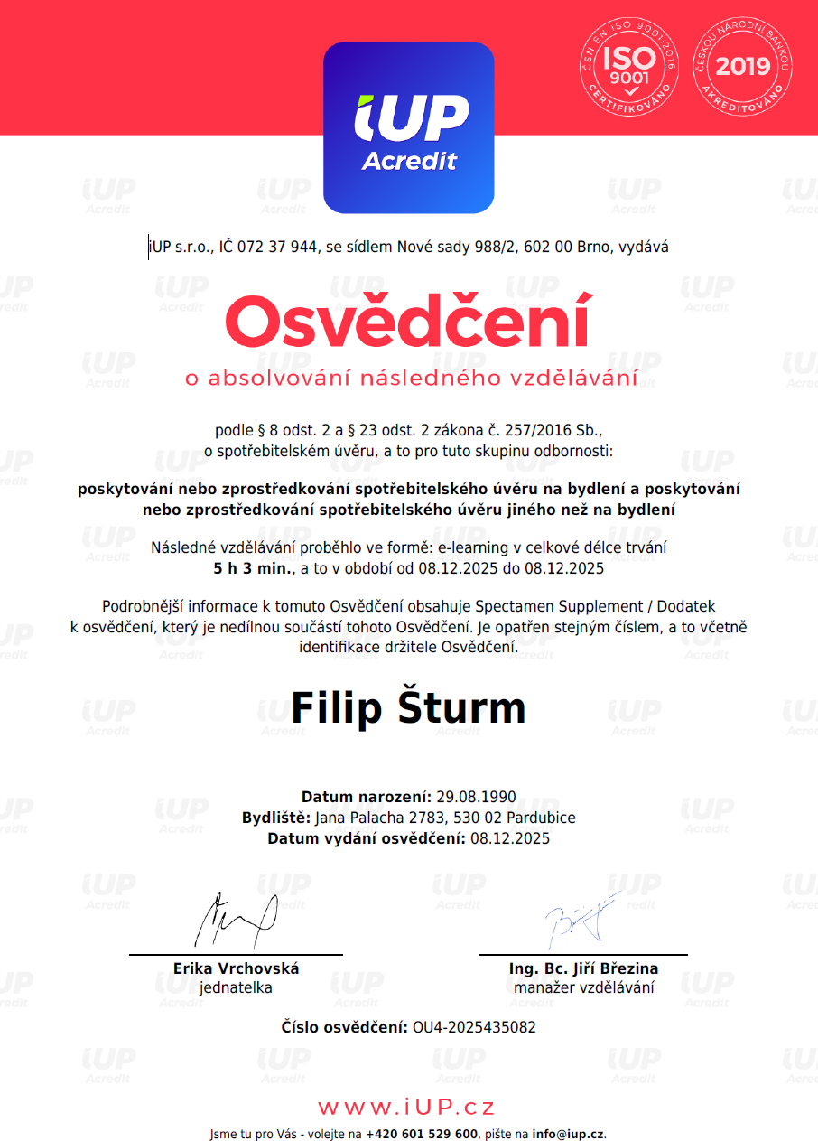 Moc s manželem děkujeme za služby pana Šturma, které jsou založeny na rychlé a efektivní komunikaci, přátelského jednání a profesionálního přístupu. Pan Šturm nám pomohl s koupí prvního bytu na hypotéku s převodem družstevního podílu do osobního vlastnictví kupujícího. Opravdu vše proběhlo hladce a mohli jsme se kdykoliv na pana poradce obrátit. I nyní po úspěšném zapsání do katastru nemovitostí se o nás (jako o své klienty stále stará). S manželem pana Šturma jednoznačně doporučujeme.