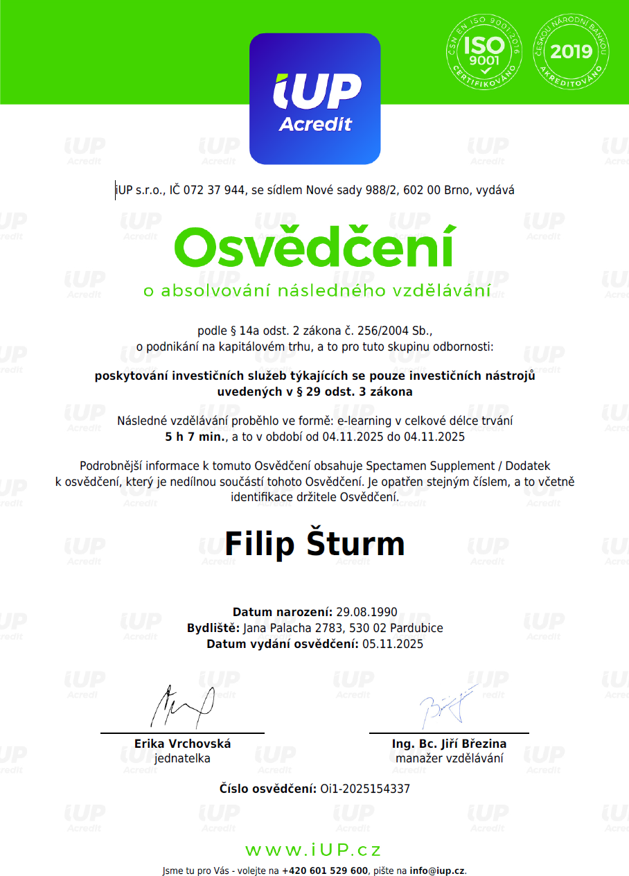 Jsem nadšený ze spolupráce s panem Šturmem, který mi poskytl nejen odborné rady týkající se produktů financí, ale také se zaměřením na akciový trh. Jeho hluboké znalosti a porozumění finančnímu světu mi poskytly jistotu a důvěru při rozhodování o mých investicích. Jeho schopnost vysvětlit složité finanční koncepty prostě a srozumitelně byla velmi ceněná. Doporučuji jeho služby každému, kdo hledá kompetentního a důvěryhodného poradce pro správu svých financí