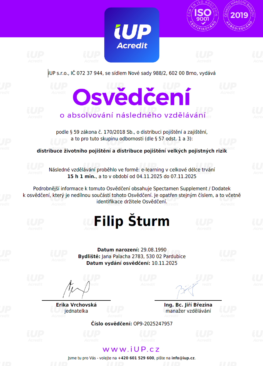 Mohu jen doporučit, pomohl mi srovnat si finance a bez jediného povzdechnutí ihned poradil a vysvětlil když jsem nějakému termínu nerozuměl. I co se týče pojištění, tak za mě P. Šturm nemá konkurenci, je vidět, že je to člověk na pravém místě