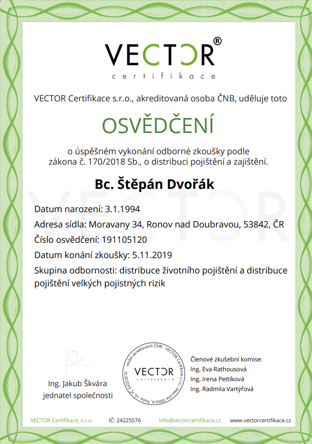 Pana Dvořáka mohu s klidným svědomím doporučit. Jeho přístup byl přesně takový, jaký jsme hledali. Pomohl nám s nastavením pojistek i s hypotékou a oceňujeme, že se nikdy nesnažil tlačit na podpis smluv za každou cenu. Při nejbližší příležitosti ho rádi doporučíme dál.