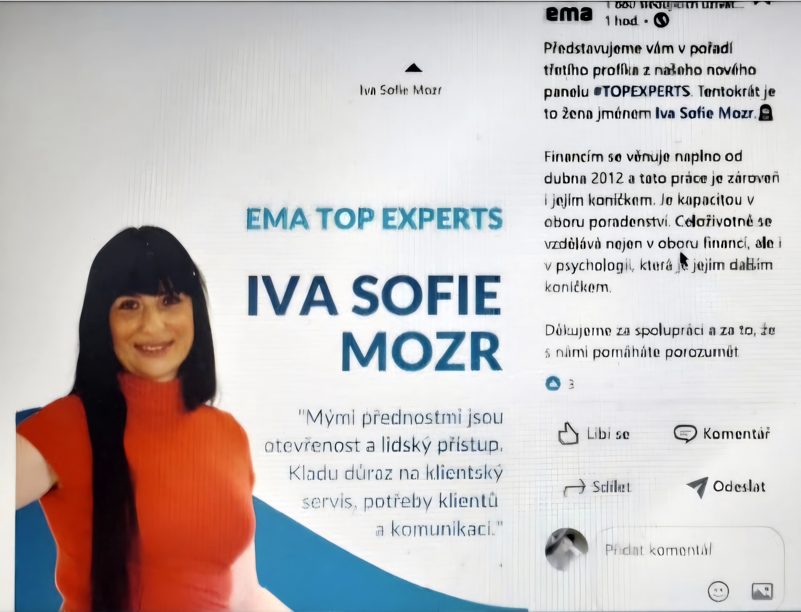 Paní Iva Mozr je kapacita v oboru poradenství. Jsem moc ráda, že jsem na ní narazila a mohla se stát její klientkou. Je to inteligentní a empatická žena, která ví co říká. Nyní už se o své finance nebojím, vím že jsem v dobrých rukou. Stačí zavolat a paní Mozr pohotově zařídí tu nejlepší variantu. Za tu dobu co se známe mi ušetřila mnoho financí a jako bonus dokáže Vás pozitivně naladit. Pokud hledáte férového poradce tak vřele doporučuji.