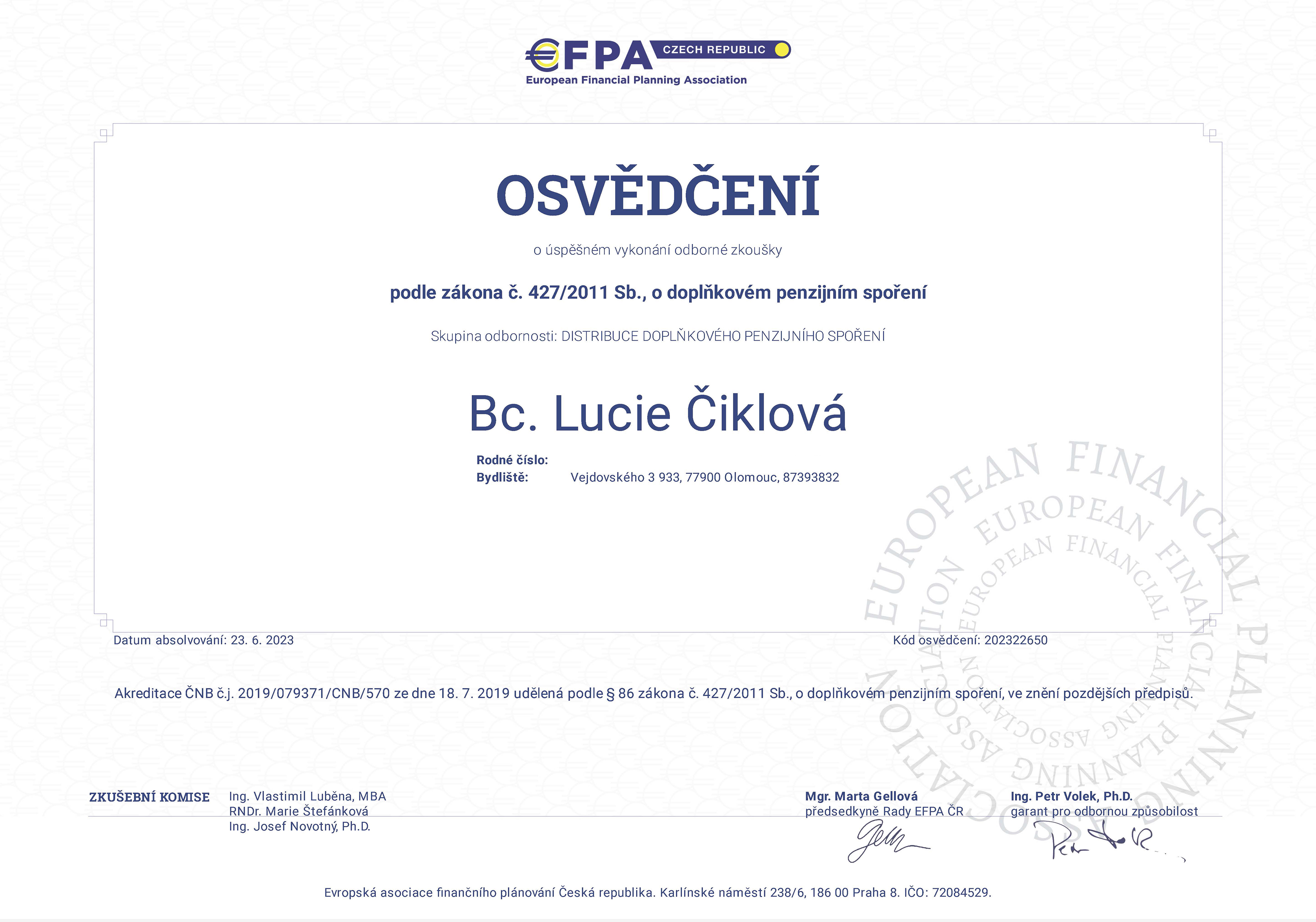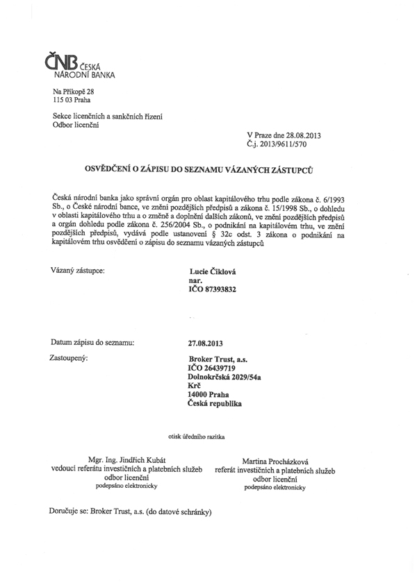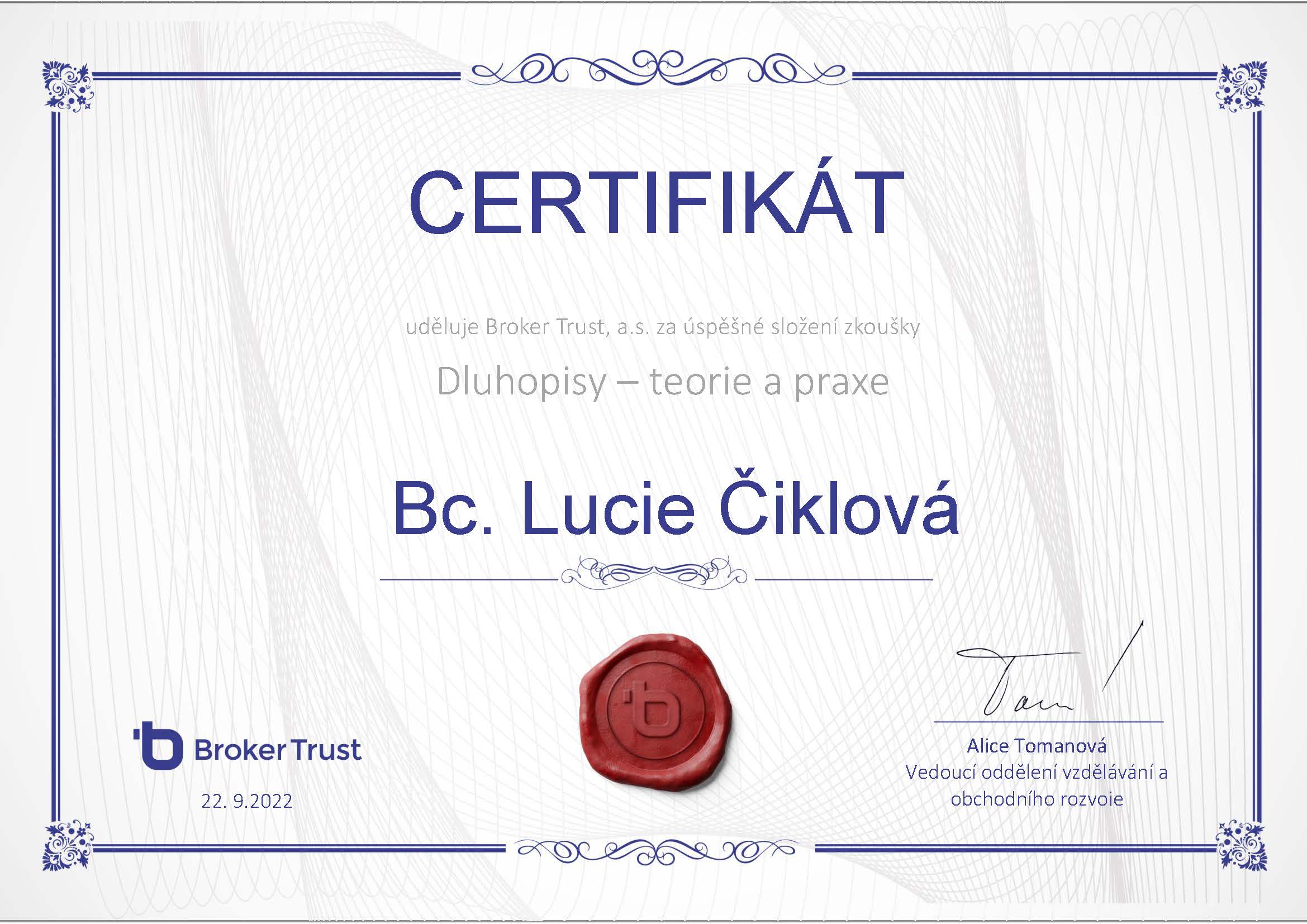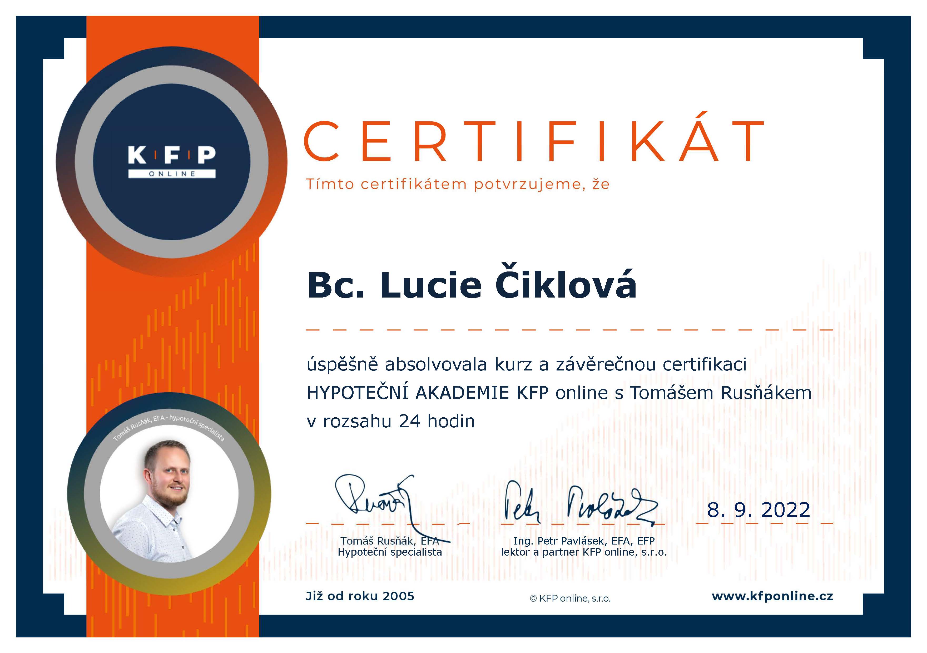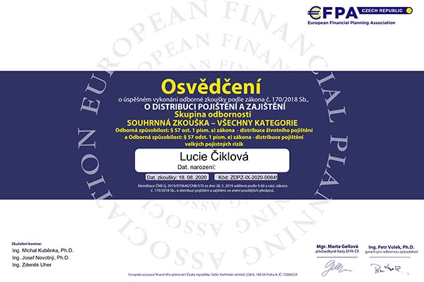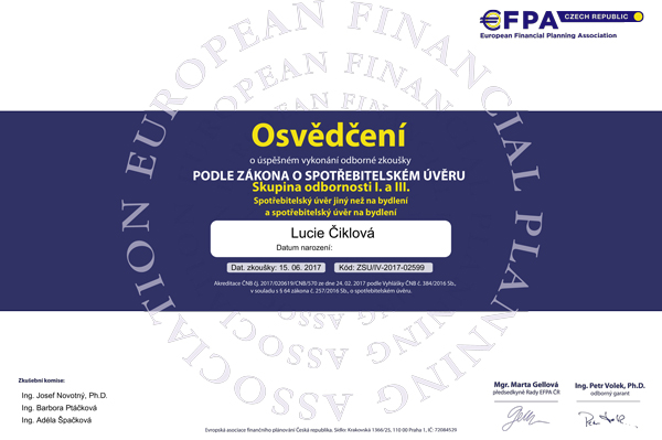 Se slečnou Lucií Čiklovou spolupracujeme již dlouho a vždy to bylo k naprosté spokojenosti. Ať se jednalo o vyřízení hypotéky, jakéhokoliv pojištění, investic či spoření, vždy nám doporučila a následně i vyřídila variantu, produkt vhodný pro nás a naše potřeby. Určitě mohu spolupráci vřele doporučit. Je to opravdový profesionál, který své práci rozumí.