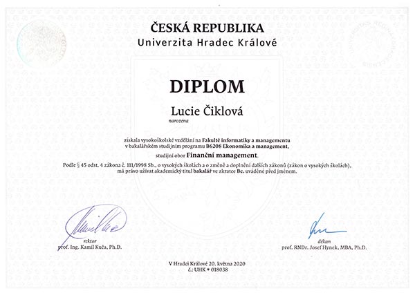 Ve financích se pohybuji již od roku 2010, vystudovala jsem Finanční management na UHK a obor Finance, se specializací na Finanční trhy na UTB ve Zlíně. Klientům pomáhám zorientovat se v nabídkách bank, pojišťoven a jiných finančních institucí a zakládám si na dlouhodobé spolupráci. Nabízím své zkušenosti a služby každému, kdo chce mít přehled ve svých financích a zodpovědně se o ně starat.