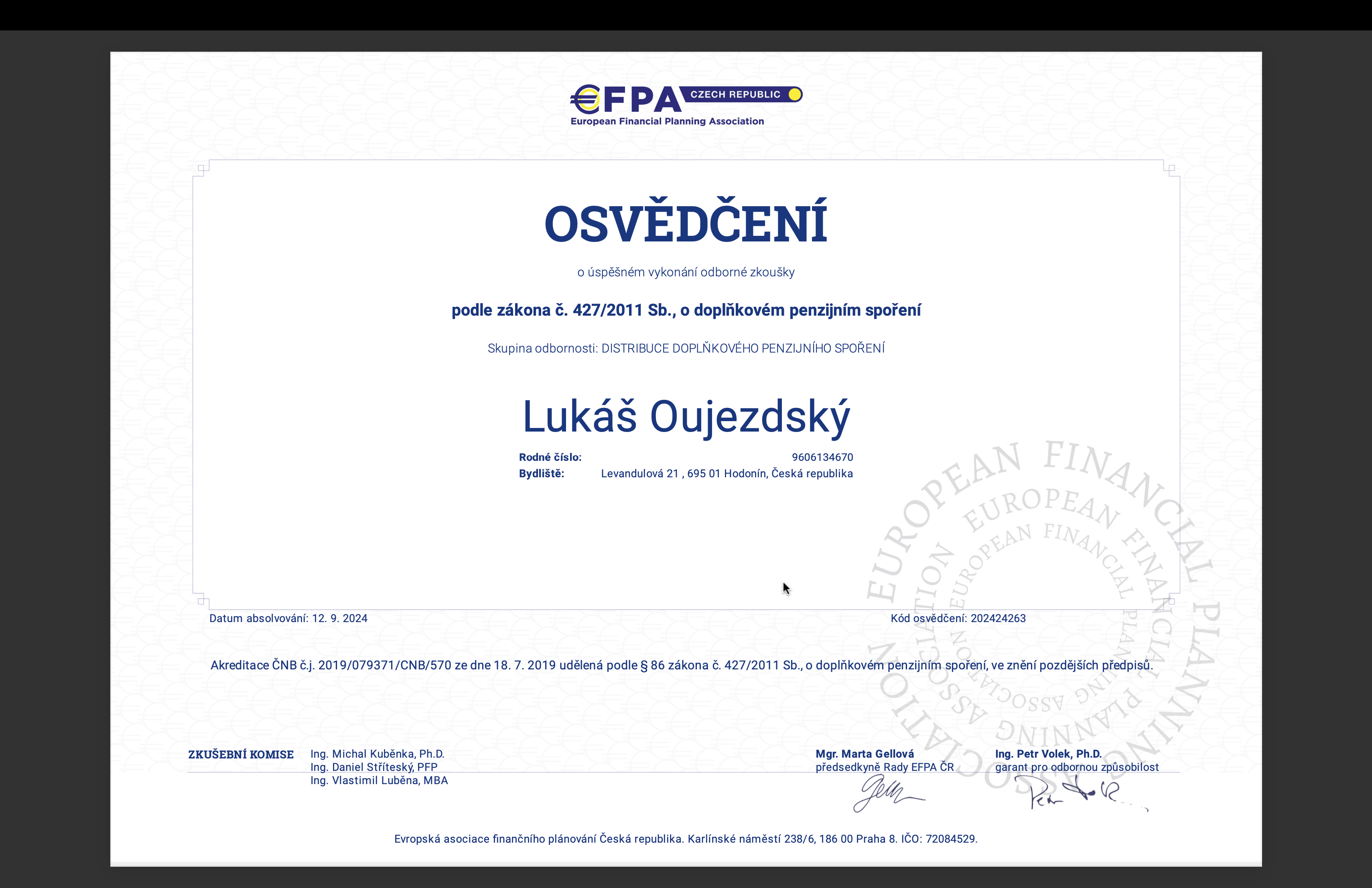 Spolupráce s panem Oujezdským byla skvělá. Jeho profesionální a přátelský přístup mě velmi mile překvapil. Pečlivě vysvětlil všechny možnosti a pomohl mi najít optimální řešení pro mou finanční situaci. Oceňuji jeho trpělivost a důkladnost, díky které jsem měl jistotu, že jsem se rozhodl správně. Pan Oujezdský si dal záležet na každém detailu a celý proces byl díky němu jasný a bezproblémový. Mohu ho jedině doporučit každému, kdo hledá spolehlivého finančního poradce.