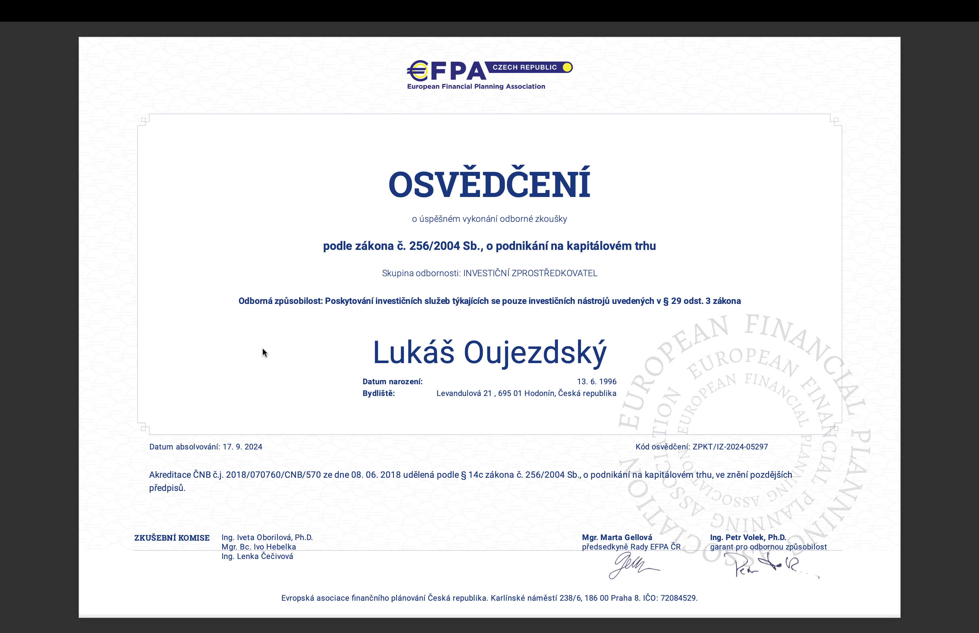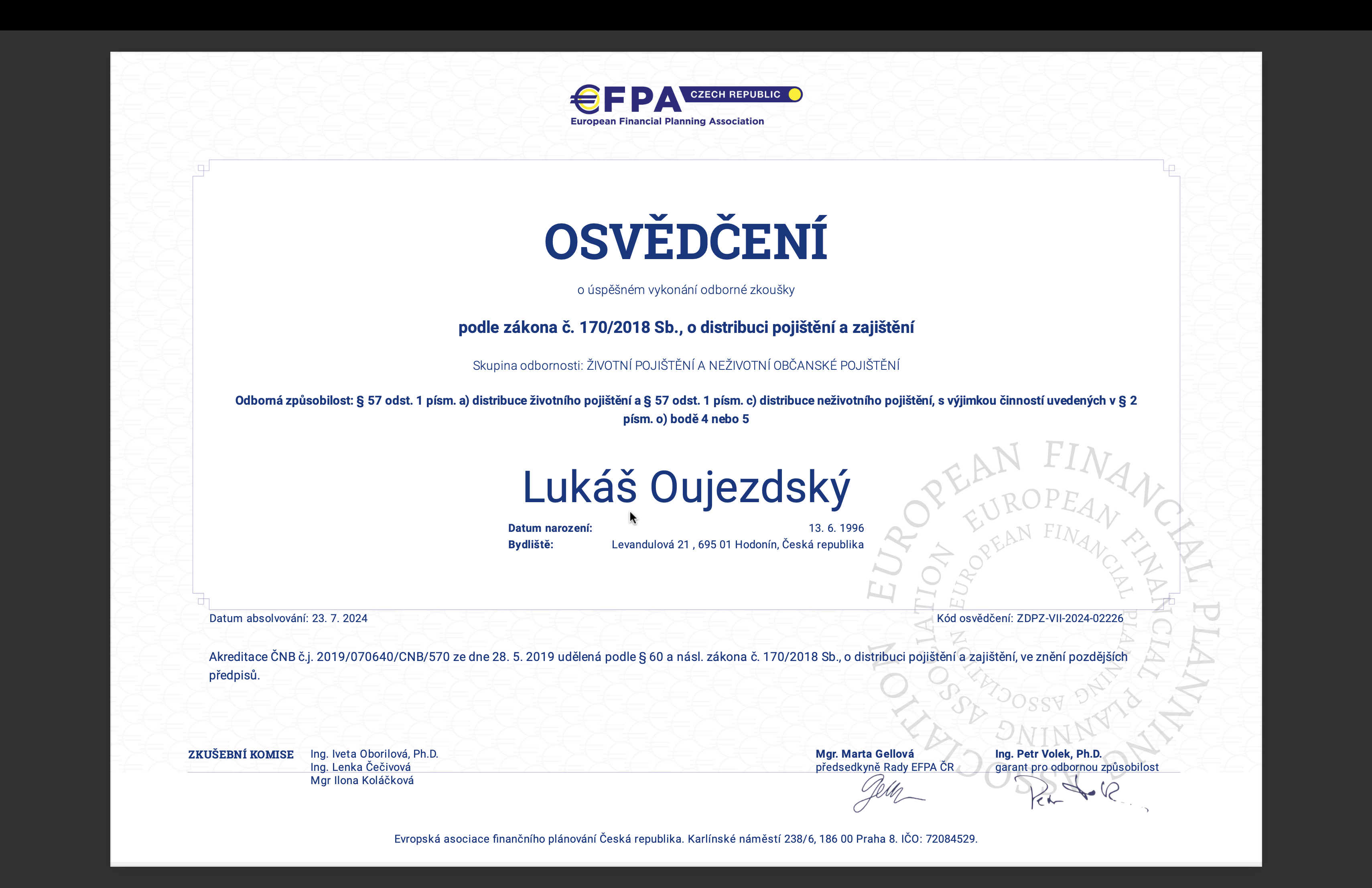 Jmenuji se Lukáš Oujezdský a už více než čtyři roky se zaměřuji na investice, které mě nesmírně baví a naplňují. Investice jsou mou vášní, ale nabízím kompletní finanční servis – věnuji se i oblasti pojištění a úvěrů, abych klientům poskytl řešení, které skutečně pokrývá všechny jejich potřeby.