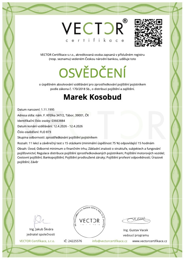 Marek Kosobud je finanční poradce, na kterého je vážně spoleh. Vždy všechno srozumitelně vysvětlí, poradí nejlepší řešení a když je potřeba něco vyřídit, jde to rychle a bez zbytečných průtahů. Komunikace je skvělá – reaguje rychle, zajímá se, jestli je vše v pořádku a člověk má pocit, že se mu opravdu věnuje. Spolupráce s ním je profesionální, ale zároveň lidská a přátelská. Můžu ho s klidným svědomím doporučit.