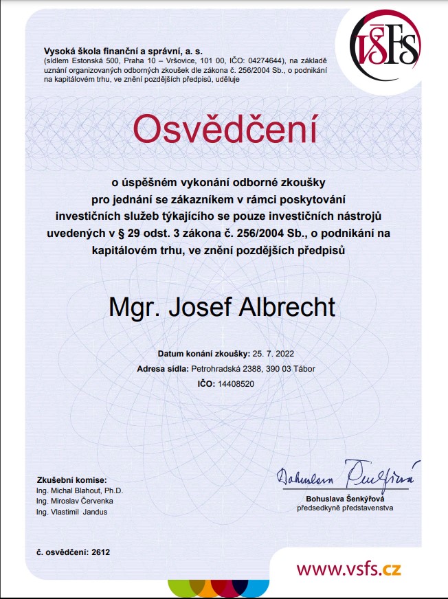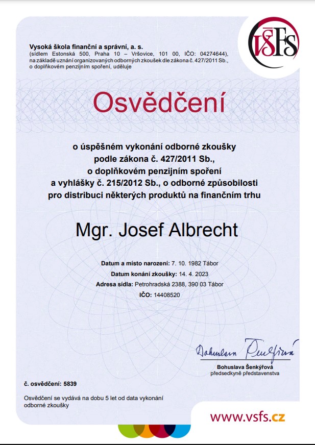 S panem Albrechtem jsem velmi spokojený. Jeho profesionální přístup, jasné vysvětlení a individuální poradenství mi pomohly udělat skvělé finanční rozhodnutí. Vřele doporučuju každému, kdo hledá spolehlivého a vstřícného finančního poradce. (9.7.2025 firmy.cz)