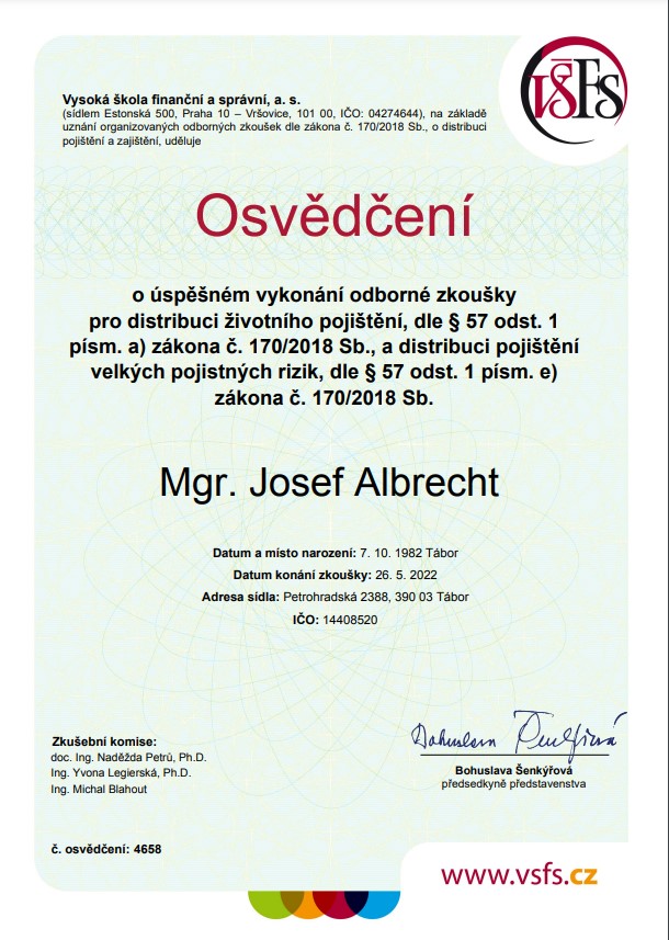 Pana Albrechta znám několik let. Spojila jsem se s ním ohledně konzultace co se týče pojištění a možného budoucího investování. Byla jsem překvapena jeho profesionálním přístupem a tím, že mi dokázal vysvětlit a zodpovědět všechny mé dotazy. Pana Albrechta a jeho služby mohu vřele doporučit!!!